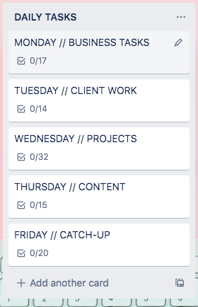 This is what works for ME. That doesn’t necessarily mean it will work for YOU, but it CAN give you a good start. When I first started using Trello, I had my board setup a different way, with it sectioned off by day, but it meant moving cards around, which made it so much harder to find ANYTHING. Once I created this, I felt like I could stay on track better.